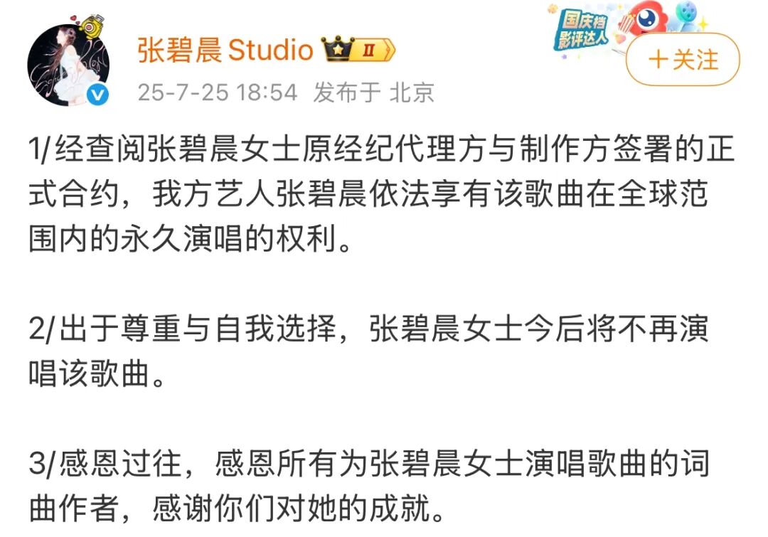 先是,网红歌手“旺仔小乔”在2021年翻唱《年轮》时,多次公开宣称“张碧晨是唯一原唱”,并拒绝标注汪苏泷的创作身份(如称:“我发一百遍也只会写张碧晨原唱”)。该言论于2025年7月被翻出,引发汪苏泷粉丝不满。汪苏泷7月25日称,称依据《著作权法》,他作为词曲著作权人拥有作品支配权,即使张碧晨声明享有“永久演唱权”,仍需以著作权人授权为前提。1/经查阅张碧晨女士原经纪代理方与制作方签署的正式合约,我方艺人张碧晨依法享有该歌曲在全球范围内的永久演唱的权利。2/出于尊重与自我选择,张碧晨女士今后将不再演唱该歌曲。3/感恩过往,感恩所有为张碧晨女士演唱歌曲的词曲作者,感谢你们对她的成就。 张碧晨粉丝:“不是你让我唱不了,是我自己不想唱了”再往前,7月23日,QQ音乐短暂移除张碧晨版《年轮》的“原唱”标签(后恢复为“双原唱”),进一步激化矛盾。收回《年轮》所有演唱授权,暂不开放任何翻唱或表演许可,强调《年轮》与《梦幻诛仙》均为“双原唱”项目。汪苏泷公司老板李思睿出示十年前项目邮件,证明创作初期已规划男女双版本同时存在。发布长文声明,援引国家级版权登记(如中国音乐著作权协会、ISRC编码)、Apple Music首发记录(2015年6月15日张版上线早于汪版6月30日)等证据,坚称张碧晨是“唯一原唱。张宣布“告别《年轮》”,感谢十年陪伴,称争议让作品被推向风口浪尖。