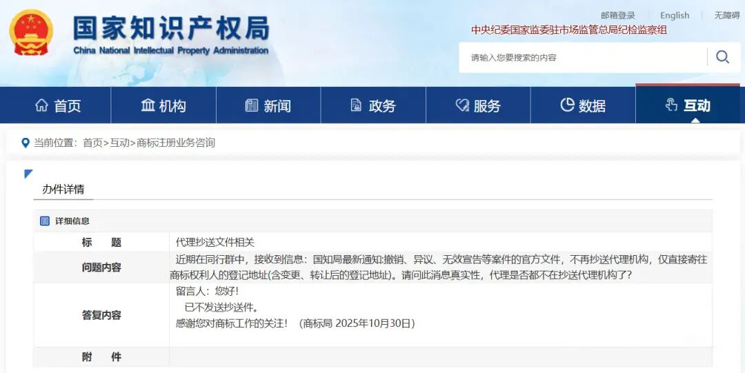 近日,多个商标交流群都在讨论商标局对于异议、撤销、无效宣告不再抄送代理机构的事情,也有商标代理机构在国家知识产权局的留言平台就上述事项进行了提问,2025年10月30日得到答复是商标局已不发送抄送件给代理机构。