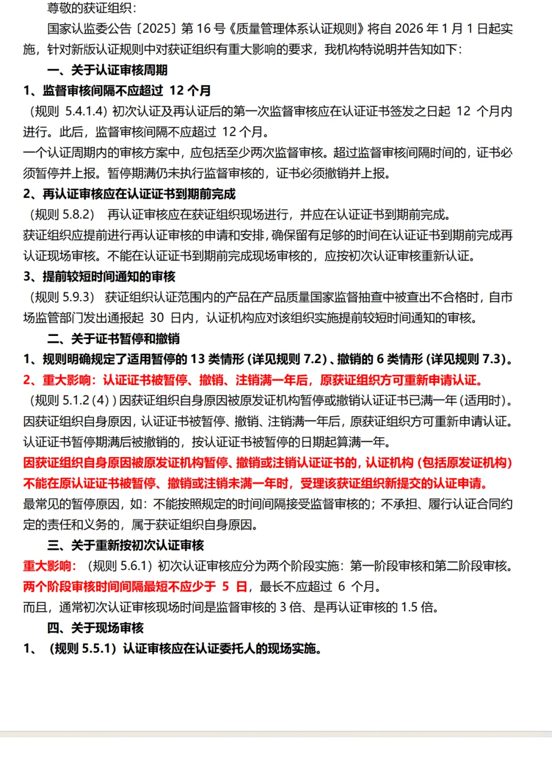 【告知函】关于国家认监委《质量管理体系认证规则》对获证组织重大影响事项的告知函